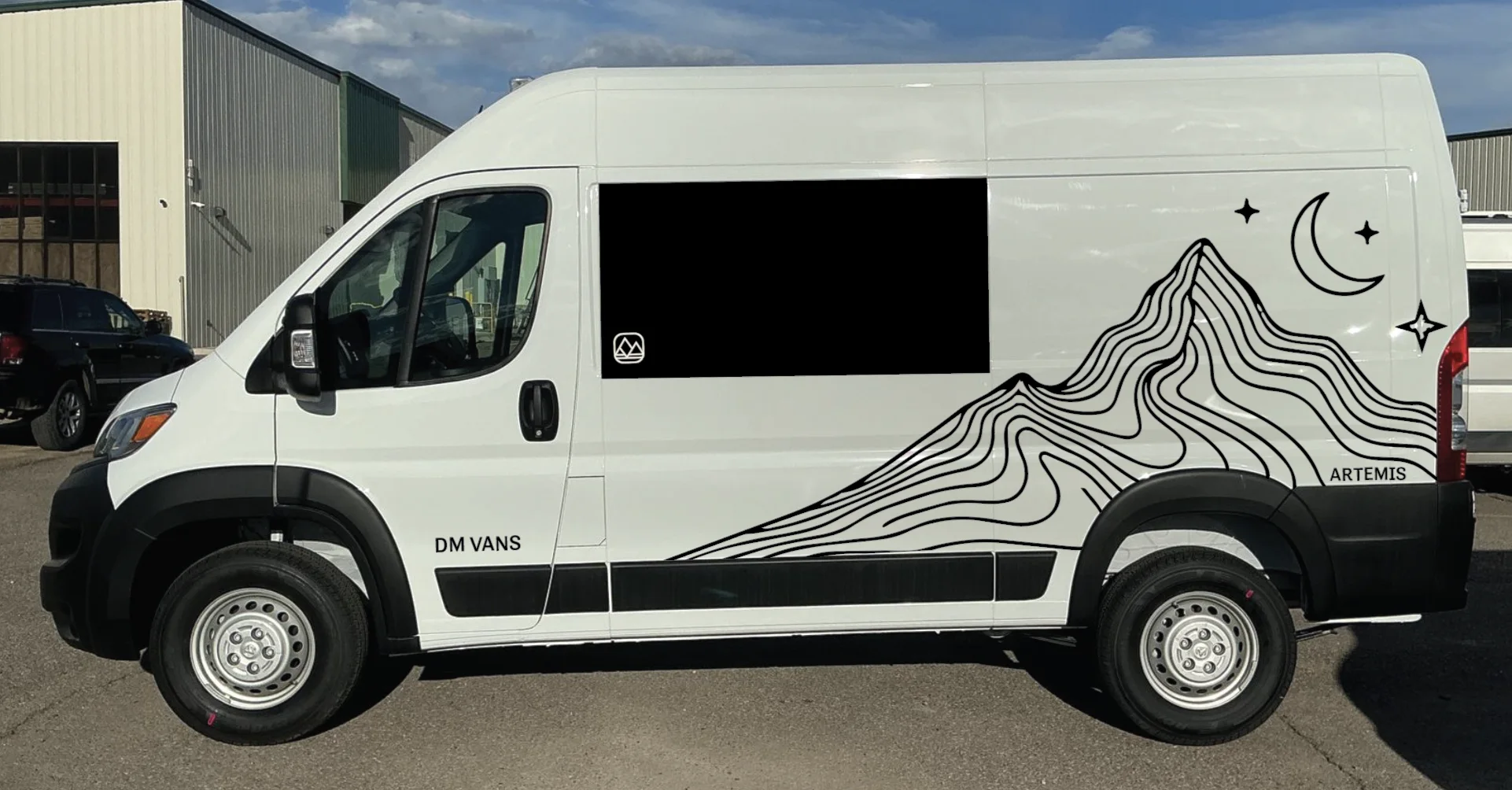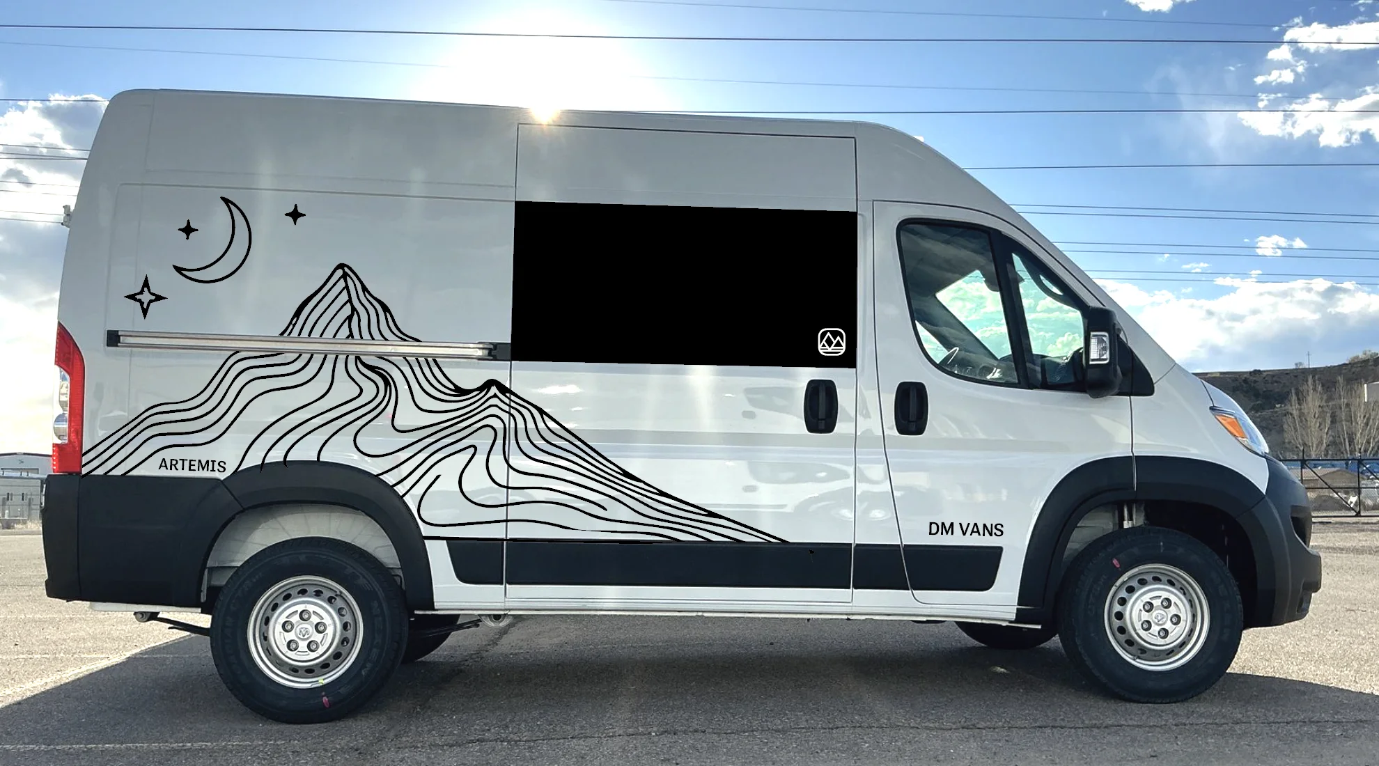 The Artemis Edition is a limited production run from DM Vans. Four LV3s and three LV5s, all finished in white and carrying an exclusive vinyl decal package you won't find on any other van in our lineup. The design features flowing topo-line mountains with a crescent moon and stars along both sides of the body, tying the spirit of terrestrial exploration to the moment humans returned to the Moon aboard Artemis II.